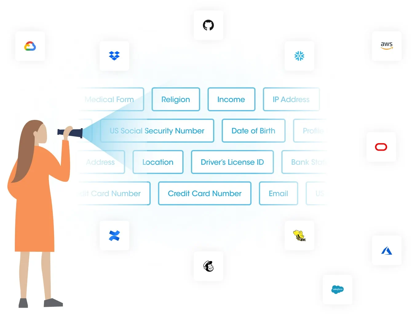 Discover hundreds of personal & sensitive data attributes such as name, address, credit card number, social security number, medical record number and many more in any structured & unstructured databases.