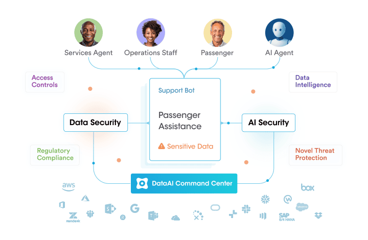 • Discover sanctioned and shadow AI across SaaS, operations, passenger services, and support systems.