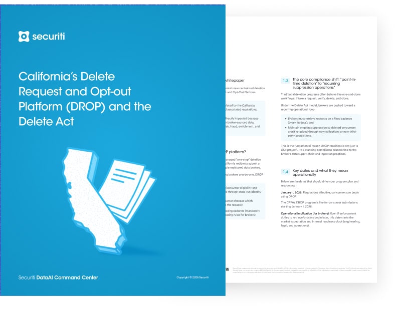 This whitepaper explains California’s centralized deletion mechanism, DROP, and what it means for data brokers directly regulated by the California Delete Act and CPPA, and organizations indirectly impacted because they buy, ingest, or rely on broker-sourced data for marketing, risk, fraud, enrichment, and AI/ML.