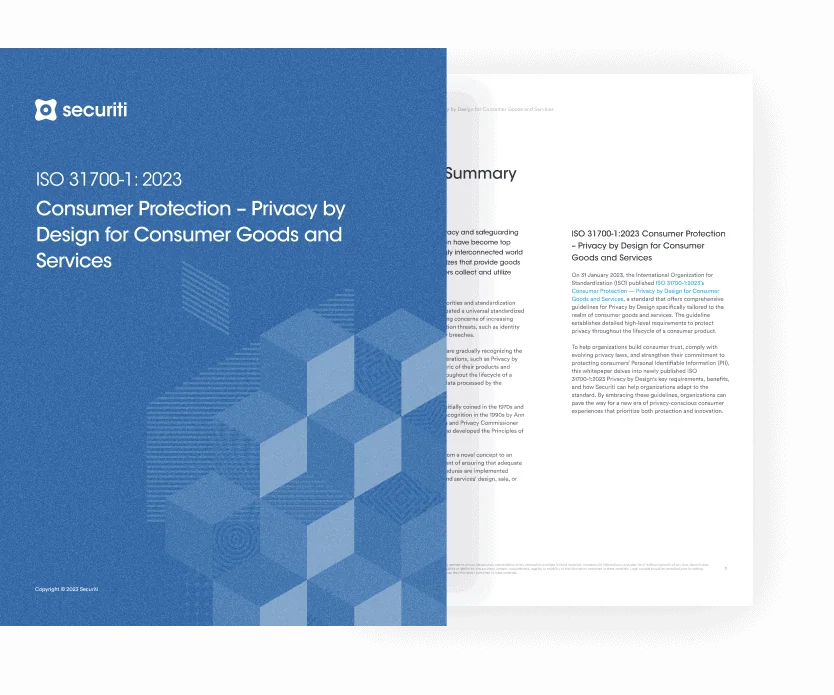 This whitepaper delves into the core principles and practical implementation of ISO 31700-1:2023 – Privacy by Design for Consumer Goods and Services and how Securiti can help. It explores how integrating privacy considerations into the very fabric of goods and service development aligns with regulatory requirements, fosters trust, enhances data security, and ultimately empowers consumers.